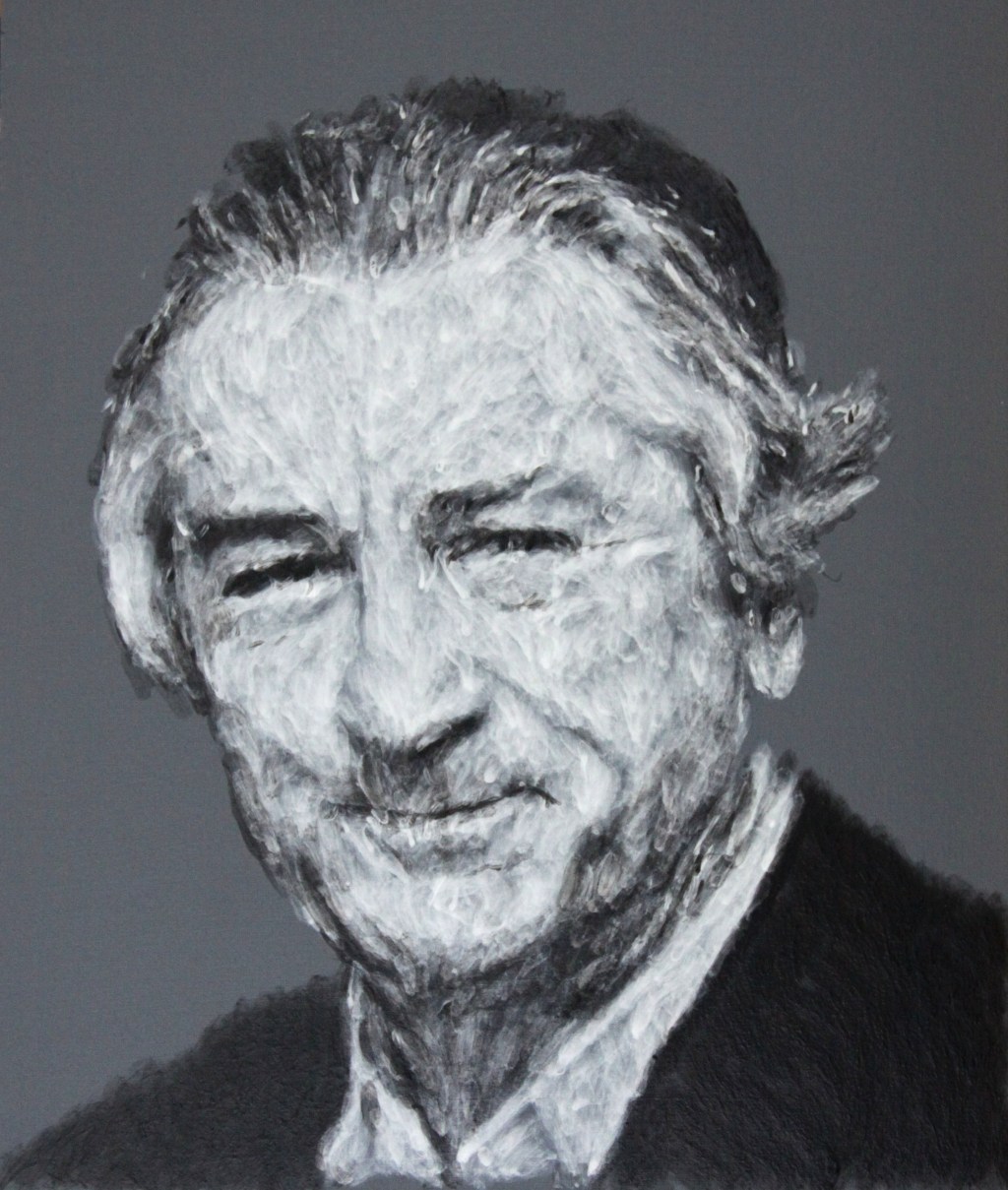 On a grey canvas we first place black strokes and in a second step add white strokes. This is an early painting that still looks quite technical